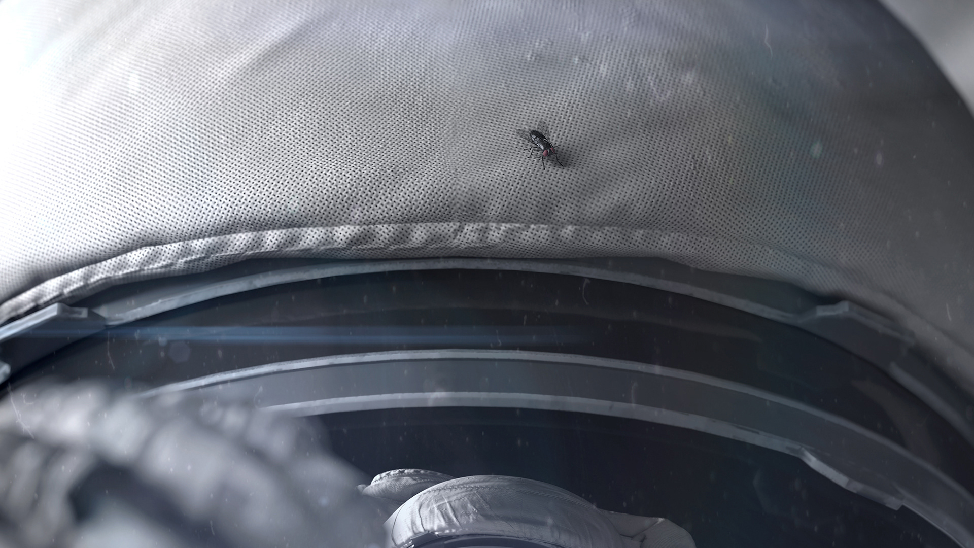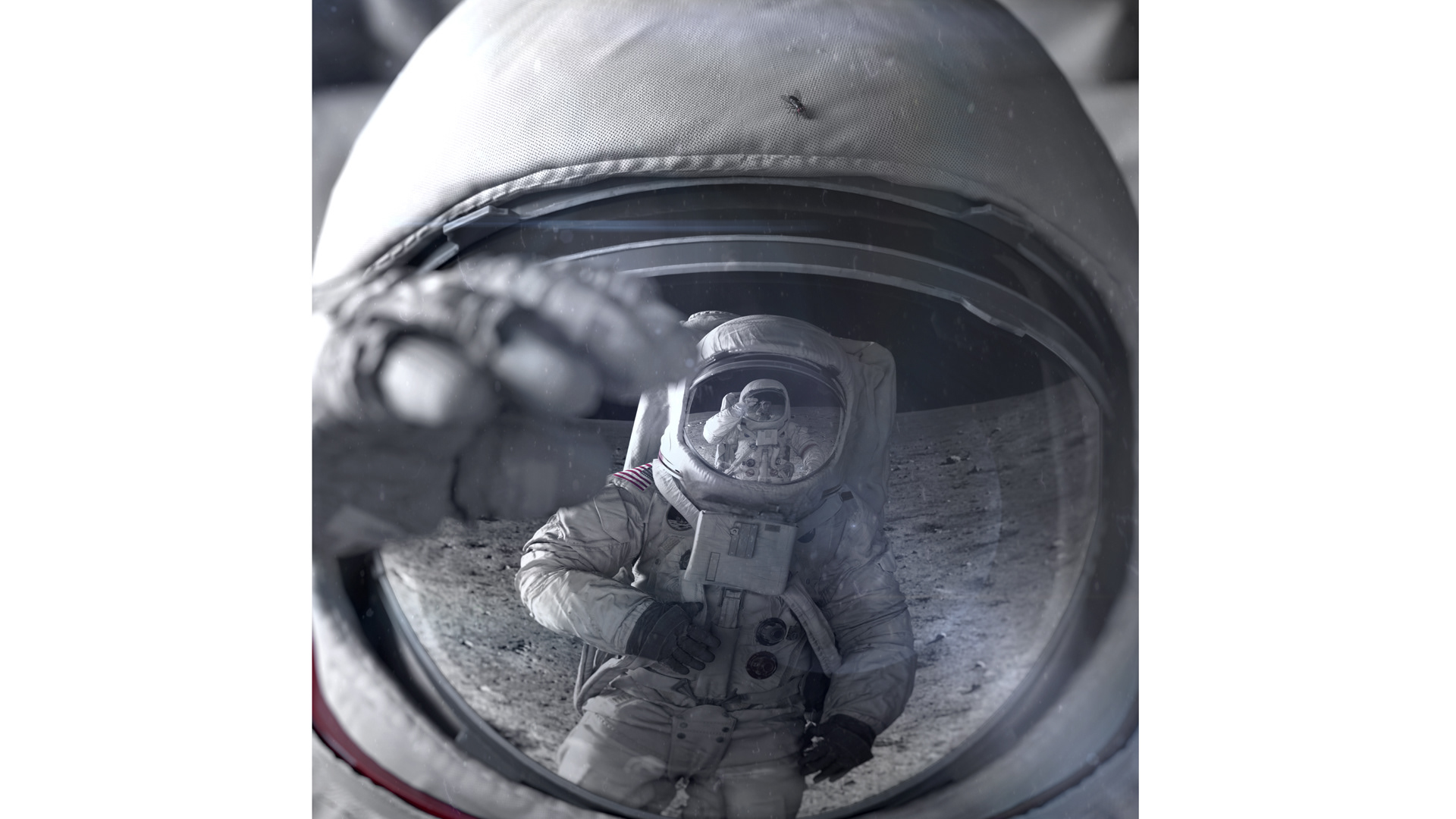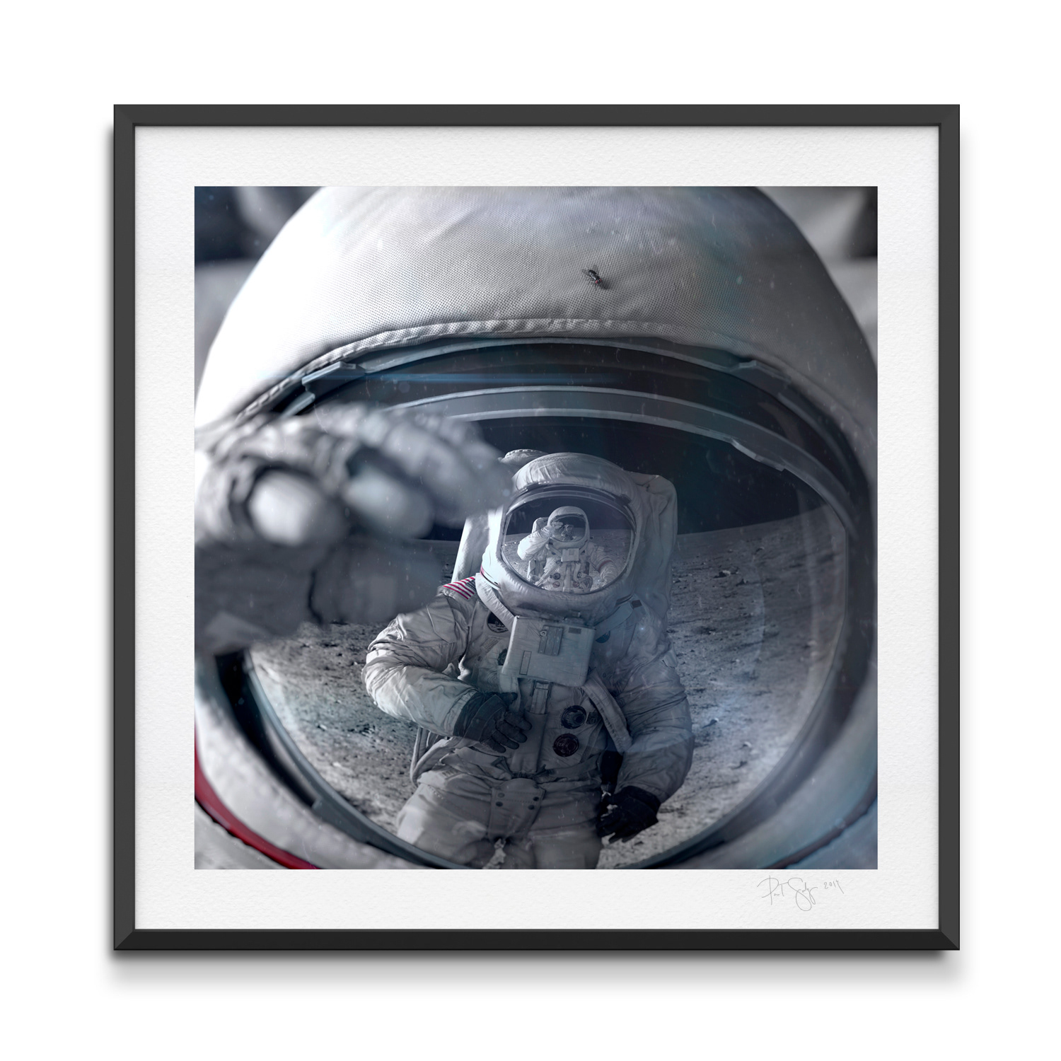 Sadaj dekonstruuje ikoniczny moment, wprowadzając do sterylnej, kosmicznej pustki element skrajnie ziemski, a zarazem trywialny – muchę, siedzącą na hełmie astronauty. Jeden drobny detal, biologiczna „usterka” w kadrze, staje się żartem, ale i katalizatorem wątpliwości. Tytuł pracy, zestawieniem słów i dwuznacznością w żartobliwy sposób wzmacnia przekaz grafiki.