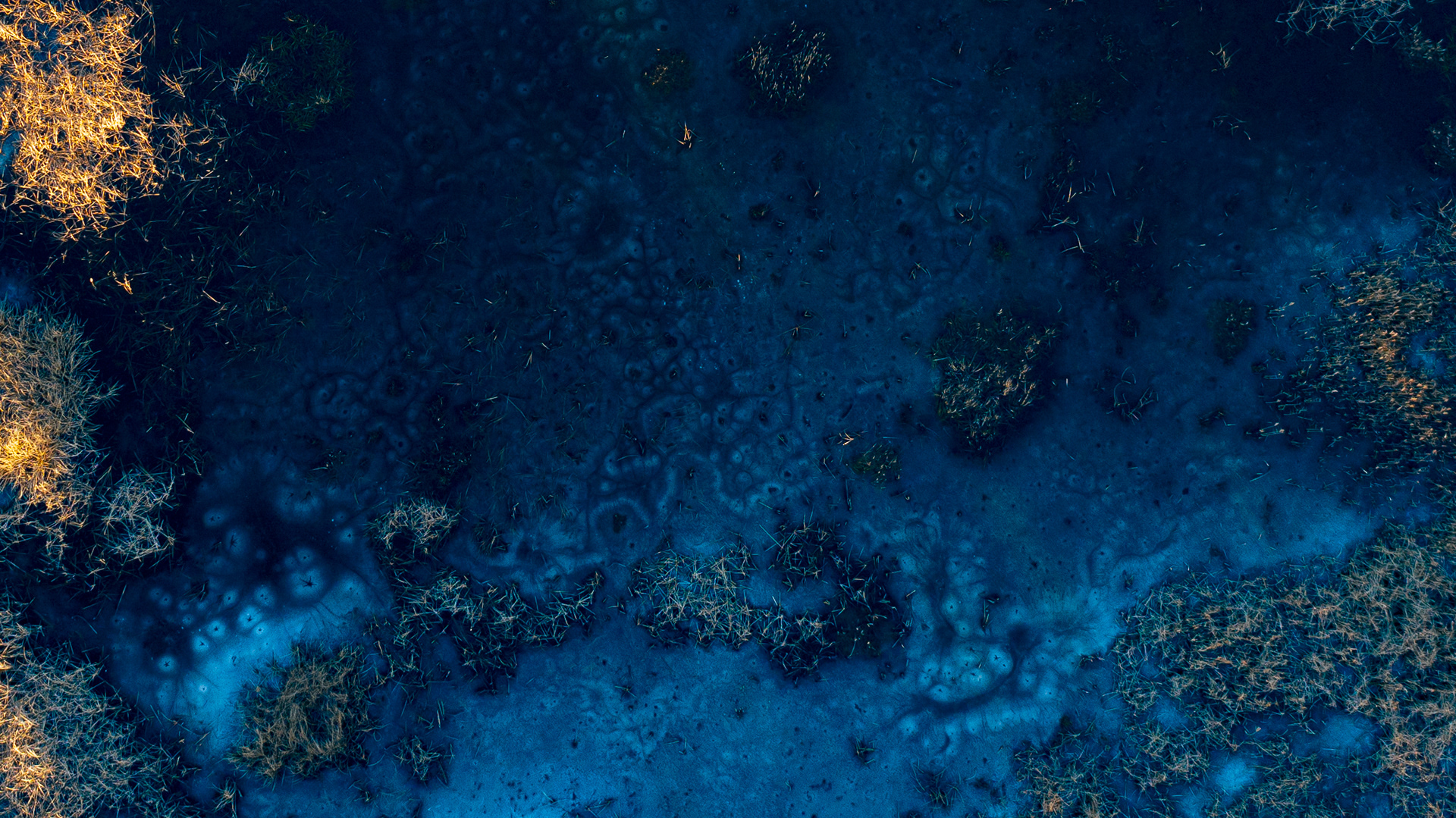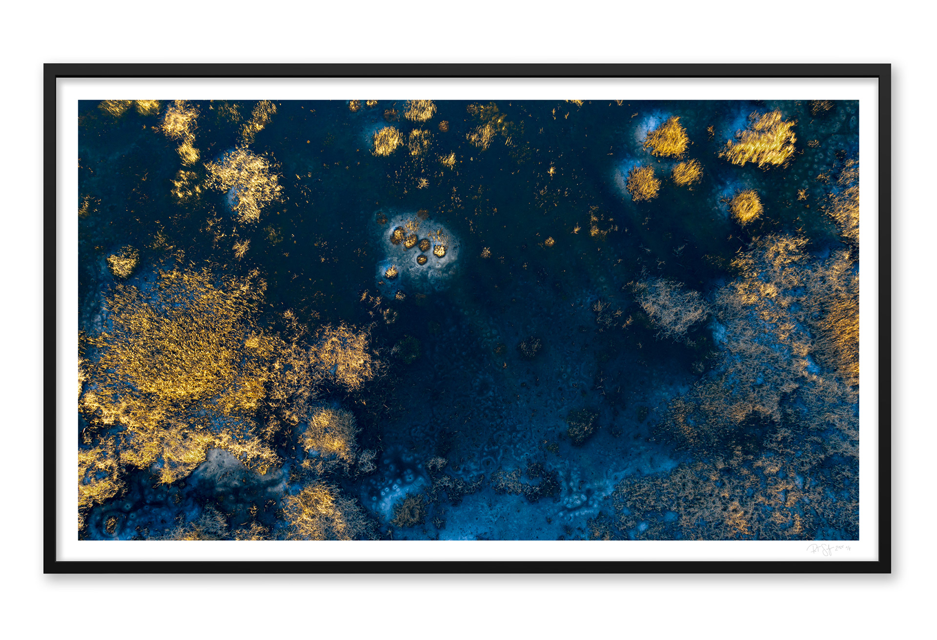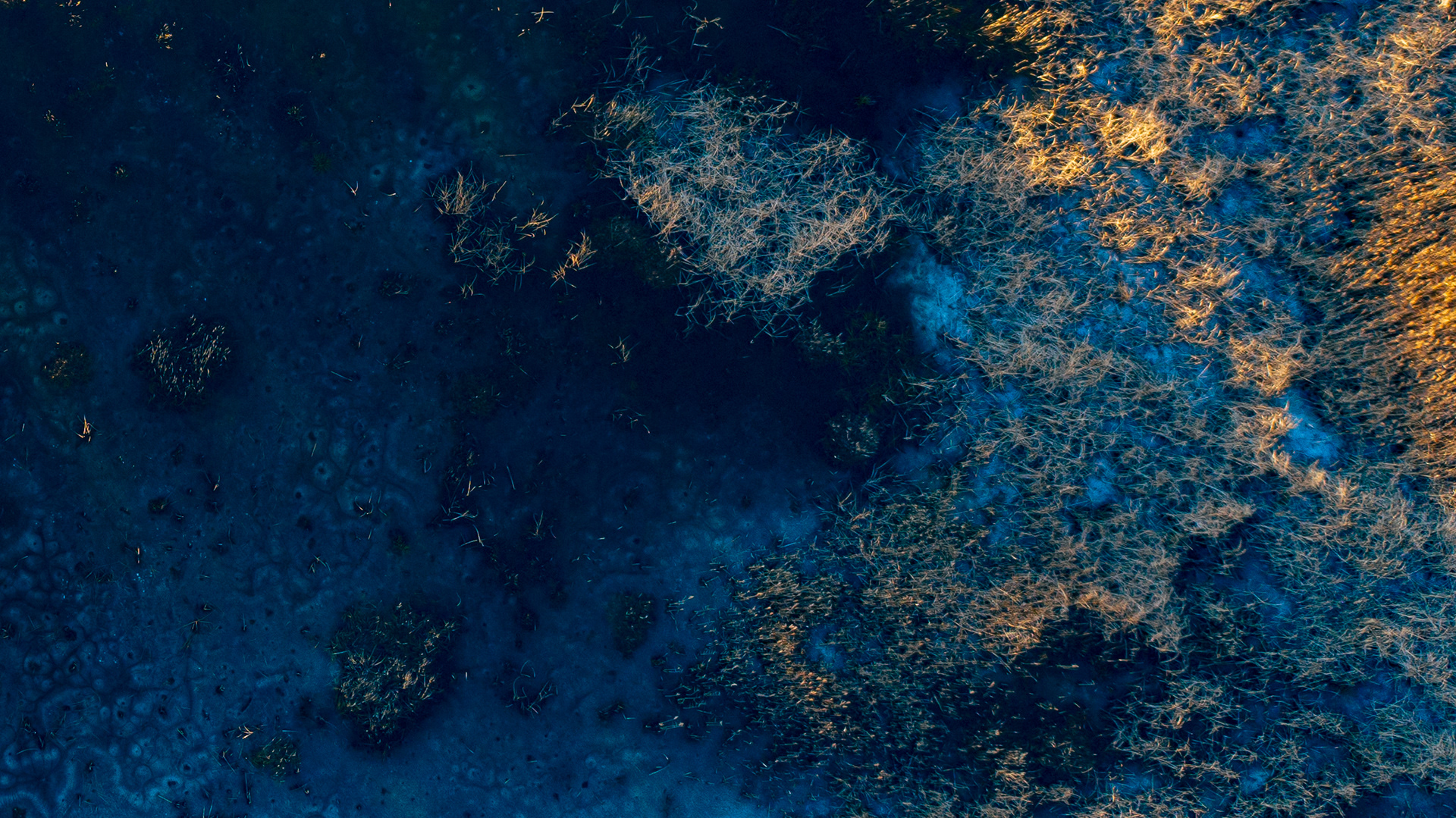 Na przeciwległych krańcach koła barw znajdują się pomarańczowy i niebieski – kolory dopełniające, które w połączeniu nabierają niezwykłej intensywności. W kompozycji zdominowanej przez głęboki błękit, w którym pomarańczowe akcenty wyglądają jak punkty świetlne, granice obu kolorów wibrują i migoczą, jakby świeciły na tle nocnego nieba. Zjawisko to nazywa się migotaniem kolorów. Kolor pomarańczowy powstaje w oku w wyniku jednoczesnej aktywności czopków wrażliwych na czerwień i zieleń, podczas gdy receptor niebieskiego pozostaje nieaktywny. Natomiast niebieski koncentruje aktywność tego trzeciego receptora i staje się kolorem dominującym w kompozycji. To połączenie w pełni angażuje wzrok widza – wszystkie trzy kanały percepcji barw zostają aktywowane, a oko zostaje zaproszone do subtelnej gry kontrastów i migoczących przejść. Obraz nie tylko przedstawia kolory, ale staje się także przestrzenią ich współistnienia, w której widzenie staje się doświadczeniem.